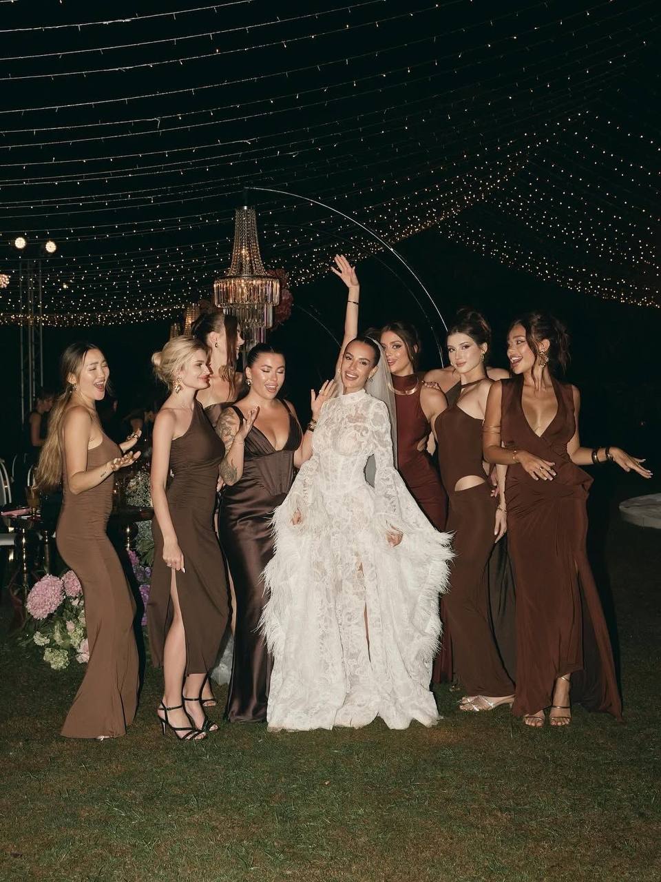 Платья или костюмы в оттенках коричневого и тёмно-бежевого. Струящиеся силуэты, приглушённые тона.